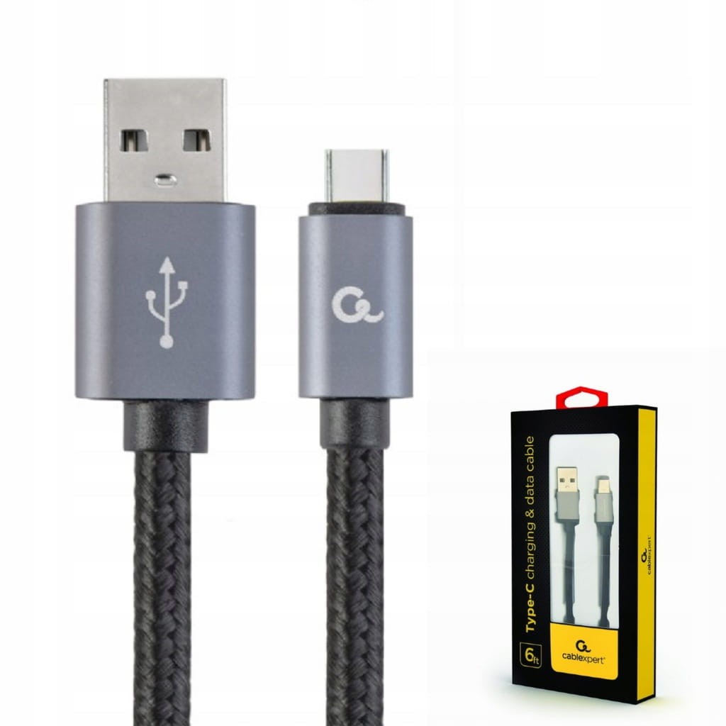 Kabel USB-A do USB-C 1.8m – pleciony bawełniany, szybkie ładowanie 2.1A, USB 2.0, metalowe wtyki, czarny