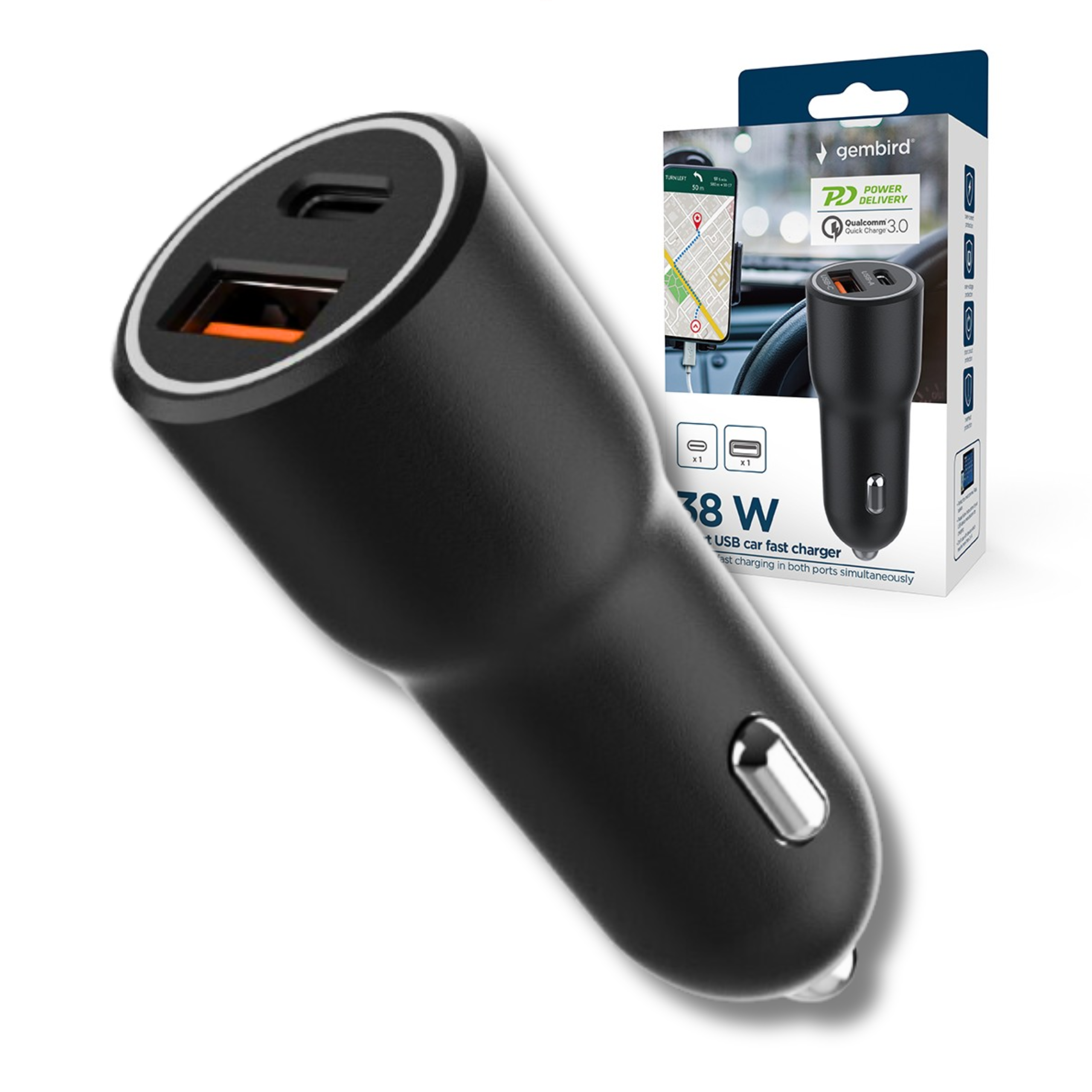 Ładowarka samochodowa 38W, Power Delivery, 2x USB (USB-C + USB-A), szybkie ładowanie, czarna