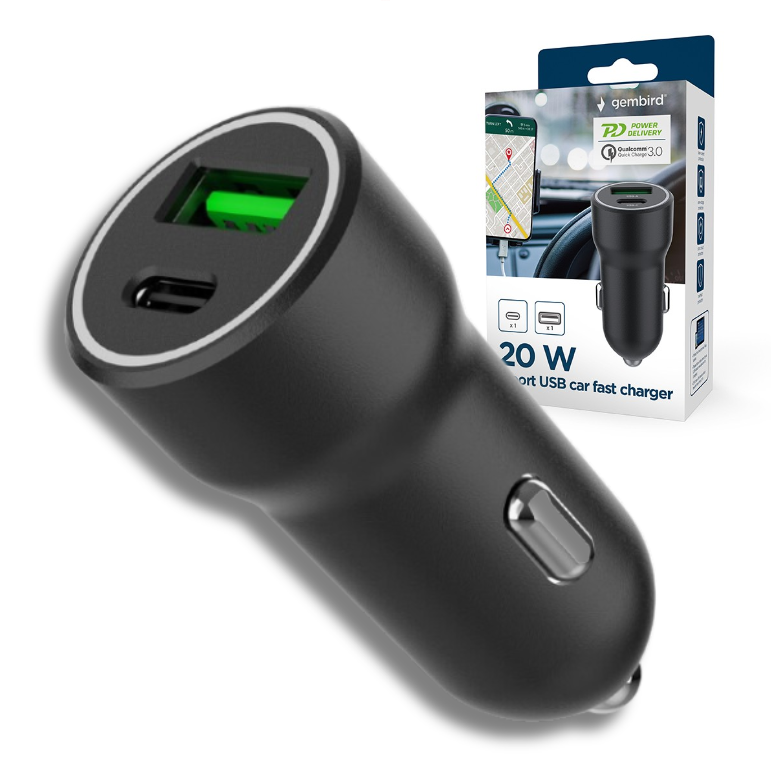 Ładowarka samochodowa USB-C 20W PD + USB-A, szybkie ładowanie, czarna”