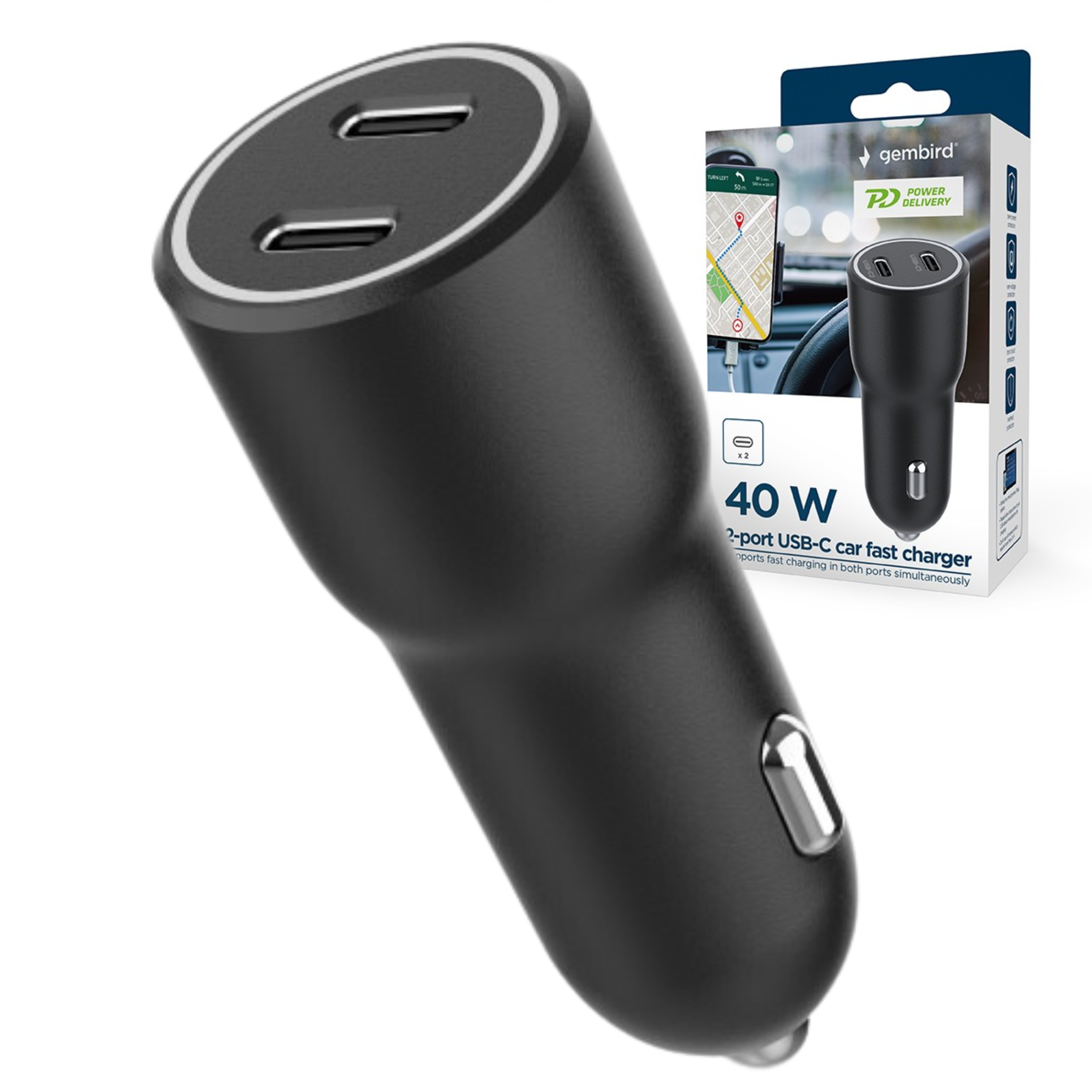 Ładowarka samochodowa USB-C 40W, Power Delivery, 2x USB (2x USB-C), szybkie ładowanie, czarna