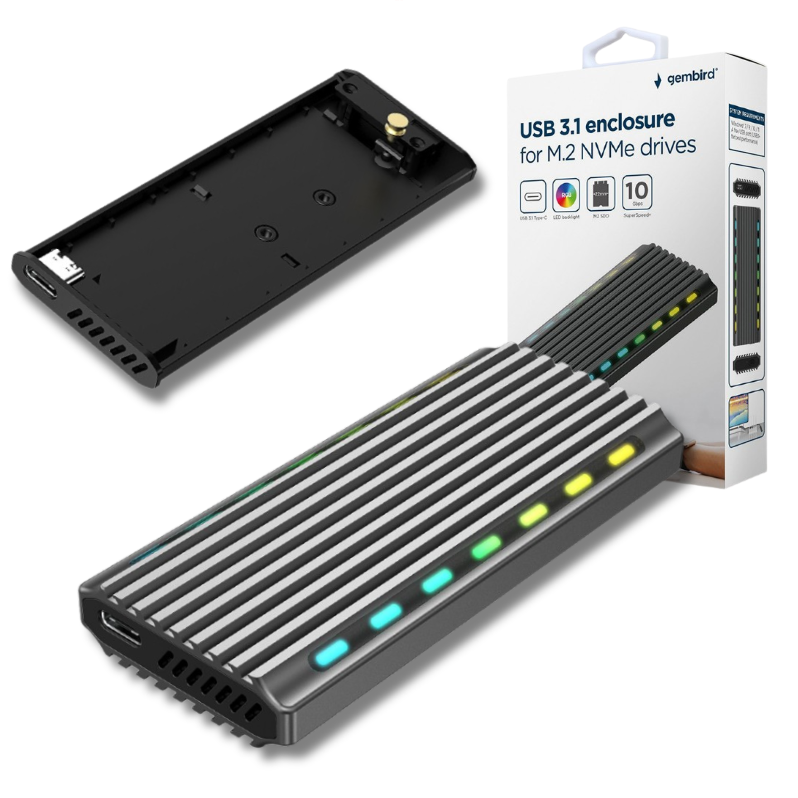 Obudowa jest kompatybilna z dyskami M.2 NVMe o szerokości 22 mm, co czyni ją uniwersalnym rozwiązaniem dla większości popularnych modeli SSD dostępnych na rynku. Dodatkowo, obudowa posiada efektowne podświetlenie LED RGB, które nie tylko nadaje jej nowoczesny wygląd, ale również pozwala na personalizację, dzięki czemu można dostosować kolory do własnych preferencji bądź estetyki stanowiska pracy.