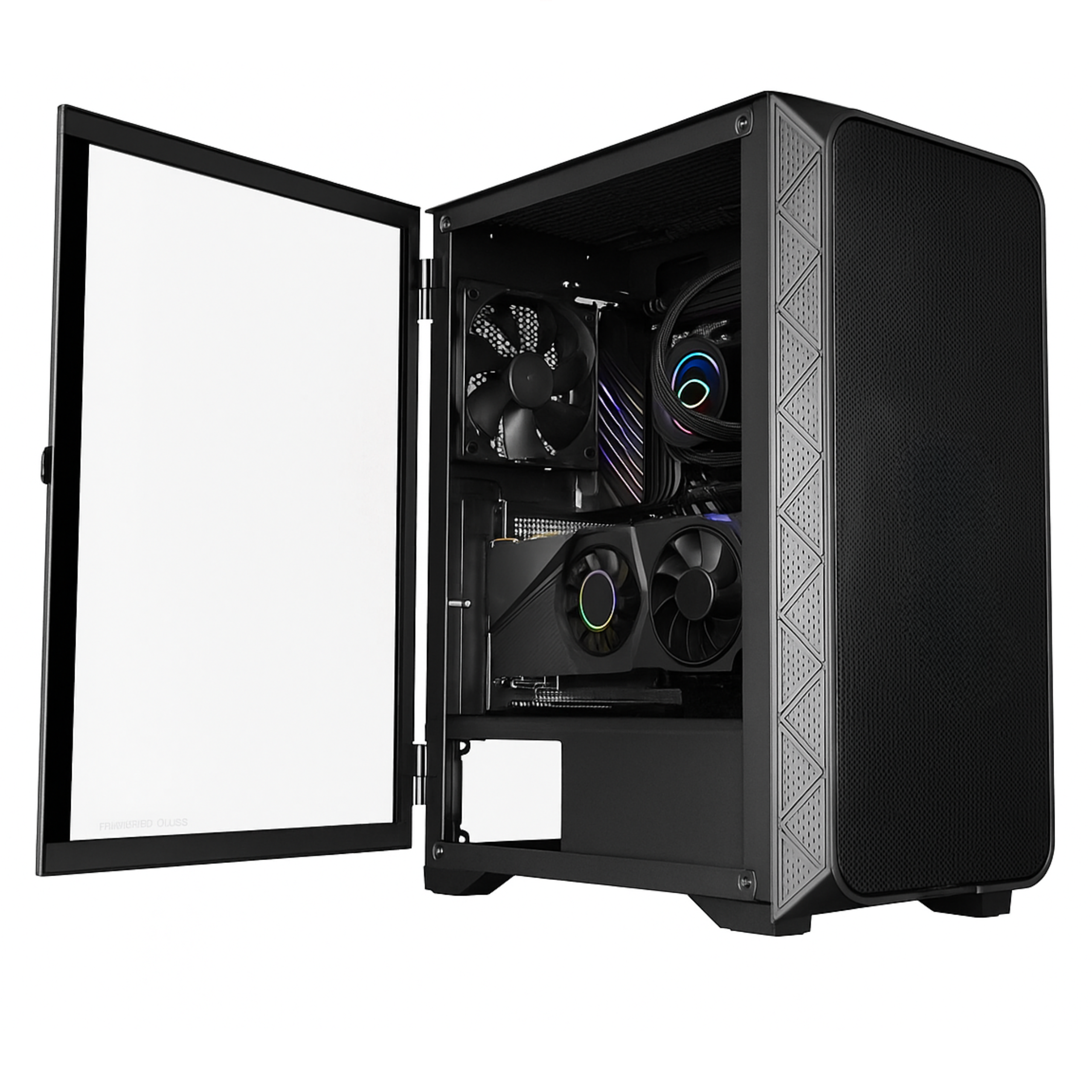 - Panel boczny z hartowanego szkła – Dzięki temu możesz zaprezentować wnętrze swojego PC, w tym efekty świetlne czy kolorowe podświetlenie wentylatorów.