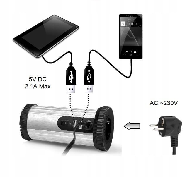 Przód konwertera wyposażony jest w gniazdo zasilania dostosowane do wtyczek stosowanych w całej Europie. Z boku produktu znajdują się dodatkowe 2 porty USB, które umożliwia ładowanie telefonów komórkowych, tabletów czytników e-booków i innych urządzeń mobilnych.