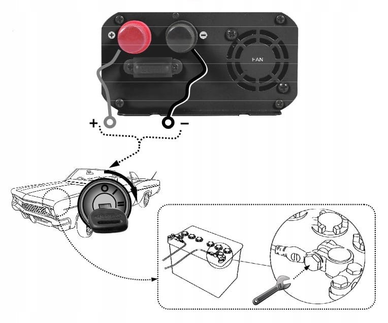 - Jeśli Twój sprzęt elektryczny zużywa więcej niż 150 W, upewnij się, że zapalniczka nie nagrzewa się, w przeciwnym razie podłącz inwerter bezpośrednio do akumulatora samochodowego, zwracając uwagę na polaryzację.