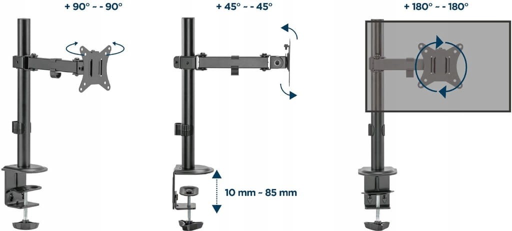 Bezpieczne mocowanie – solidny zacisk biurkowy lub opcjonalna przelotka umożliwiają szybki i stabilny montaż, dopasowany do grubości biurka od 10 do 85 mm (zacisk) lub 10–40 mm (przelotka).