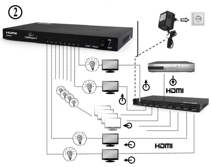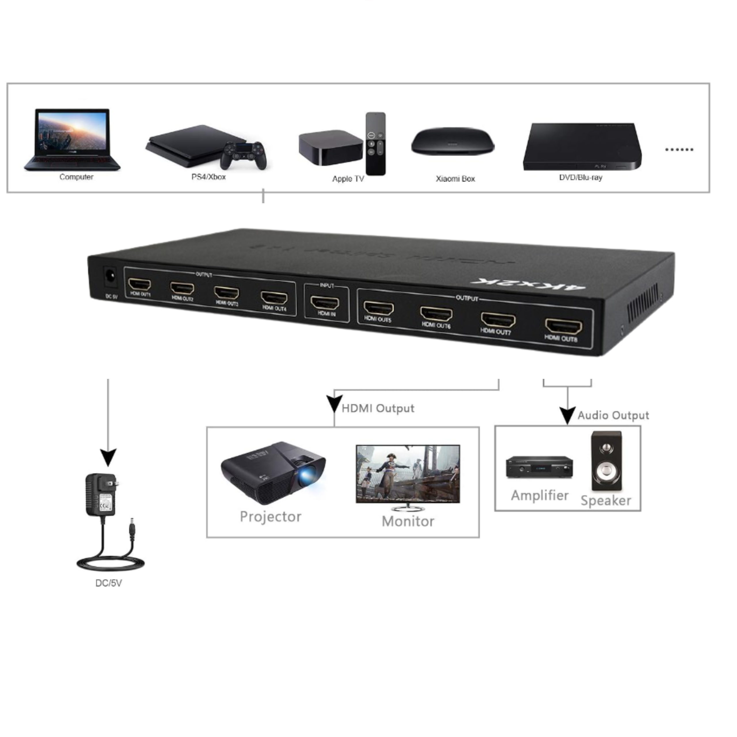 - Wysyła jeden sygnał HDMI do 8 oddzielnych monitorów, projektorów, telewizor