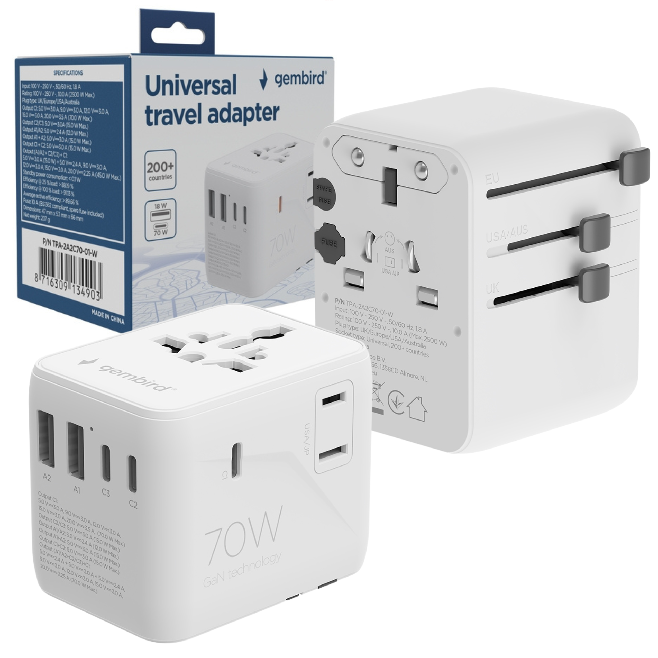 Uniwersalny ADAPTER Gniazda US UK AU CN Ładowarka GaN USB 70W Gembird