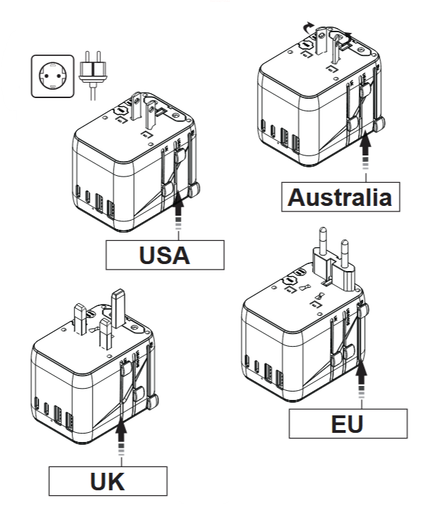 Adapter obsługuje ponad 200 krajów, dzięki wymiennym wtyczkom US/UK/EU/AU. Wbudowane uniwersalne gniazdo AC pasuje do większości typów wtyczek, więc podłączysz zarówno ładowarki, jak i inne urządzenia elektryczne, takie jak aparat czy golarka. Niezależnie od miejsca podróży – Europa, Ameryka, Azja czy Australia – zawsze masz dostęp do zasilania.