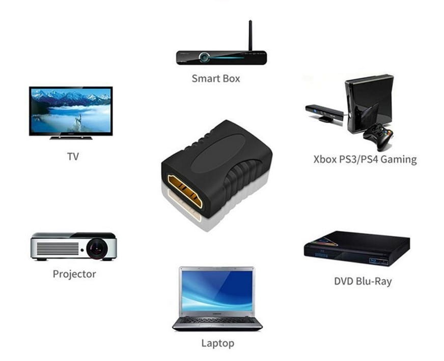 Łączenie dwóch kabli HDMI: Adapter HDMI żeńsko-żeński jest idealny do łączenia dwóch kabli HDMI, gdy potrzebujesz dłuższego połączenia. Pozwala to na przedłużenie zasięgu, np. gdy telewizor jest daleko od odtwarzacza Blu-ray lub konsoli do gier.